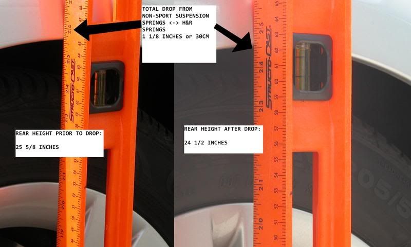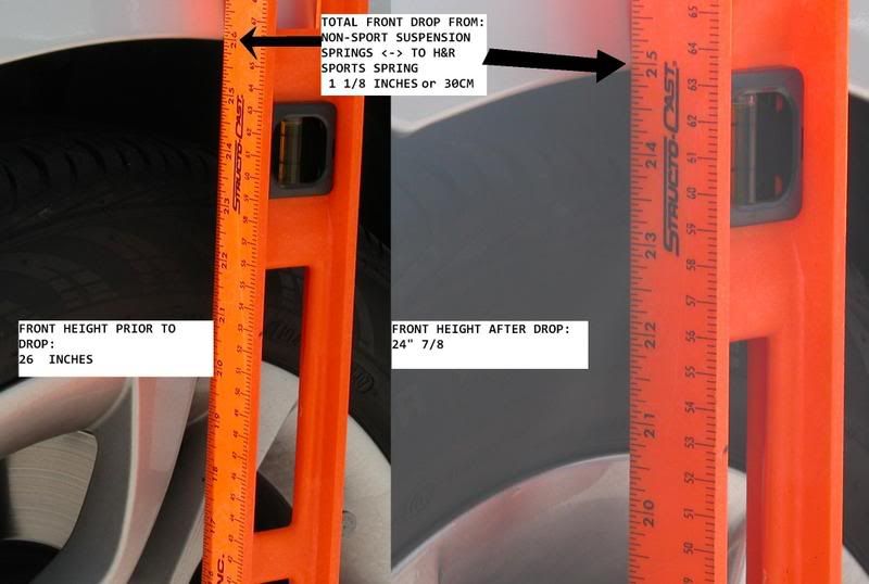 I have a 328 with stock suspension and I just had my H&R Sports srpings installed. FYI I took some pictures/Measurements of before and after heights in case you wonder how much was the drop in my car. Please note that the after installation pictures were taken right after the spings were installed so I'm not sure if I have allowed them enough time to settle in. Also my wheels are 16". Front Wheel Arch Measurement. ![]() Rear Wheel Arch Measurement. ![]() My car after the installation. ![]() my car prior installation. ![]() Hope this helps, I was one of those looking for pictures of lowered car with stock wheels, so I'm posting this before my wheels arrive (BMW Performance Wheels - ordered from Tischer )Any comments are welcomed, and yes I will post picks when the wheels arrive. |